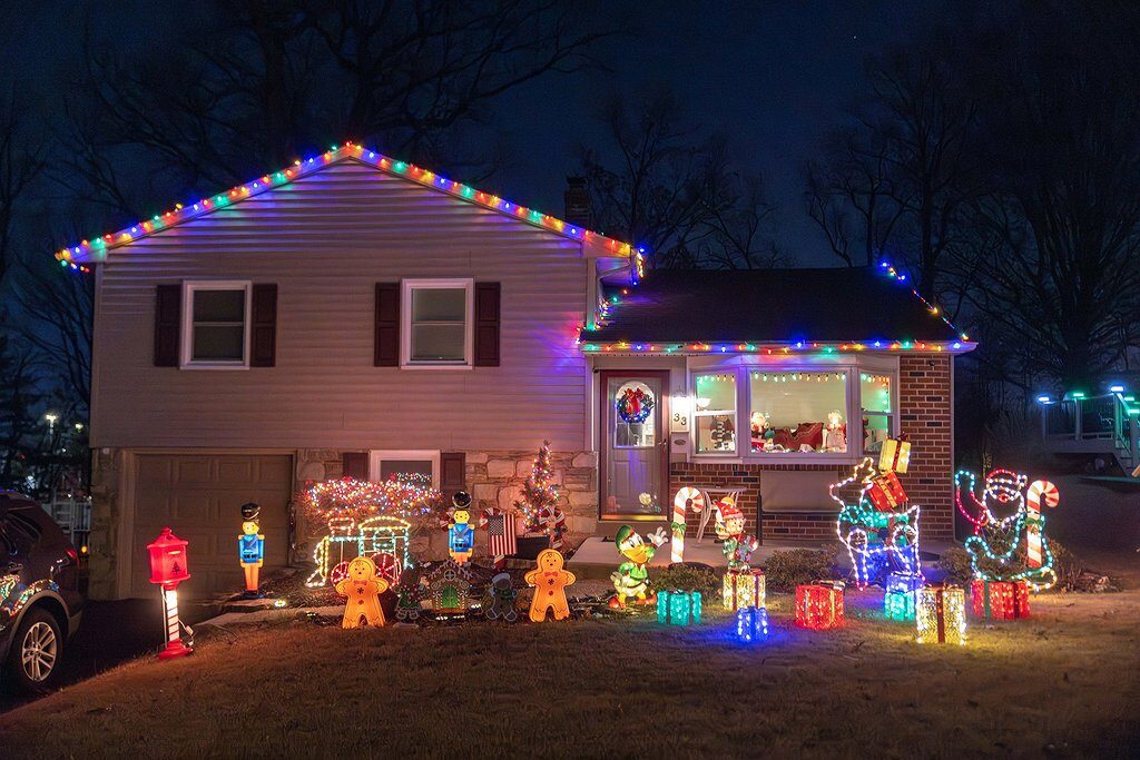 A merry-go-round, see-saw, and glowing dog mailing his letter to Santa is just the beginning at this Horsham address with a very well-lit lawn. Colorful lights line its roof, complete with bright snowflakes.