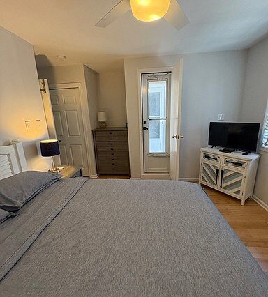 Bedroom 3: First floor, Queen bed, TV, ceiling fan, + direct exit/entry through sliding door to front porch