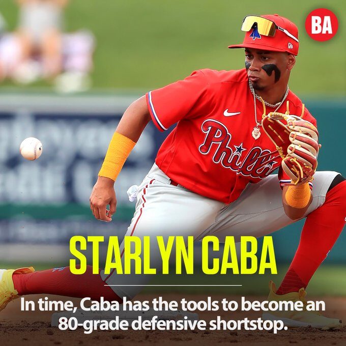 “Defensively, Caba shows elite instincts and actions at shortstop as one of the quickest infield defenders in the Phillies’ system. He has strong footwork to go with plus arm strength, which should help keep him at shortstop for the long run. Caba is also praised for his outstanding makeup, which internal evaluators say helps him act like another coach on the field.”