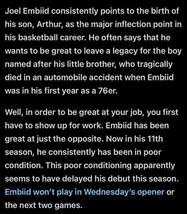 “I’ve broken my face twice. I came back early with the risk of losing my vision. Had broken fingers. I still came back. So, when I see people saying, ‘He doesn’t want to play,’ I’ve done way too much for this city putting myself at risk for people to be saying that,” Embiid said.