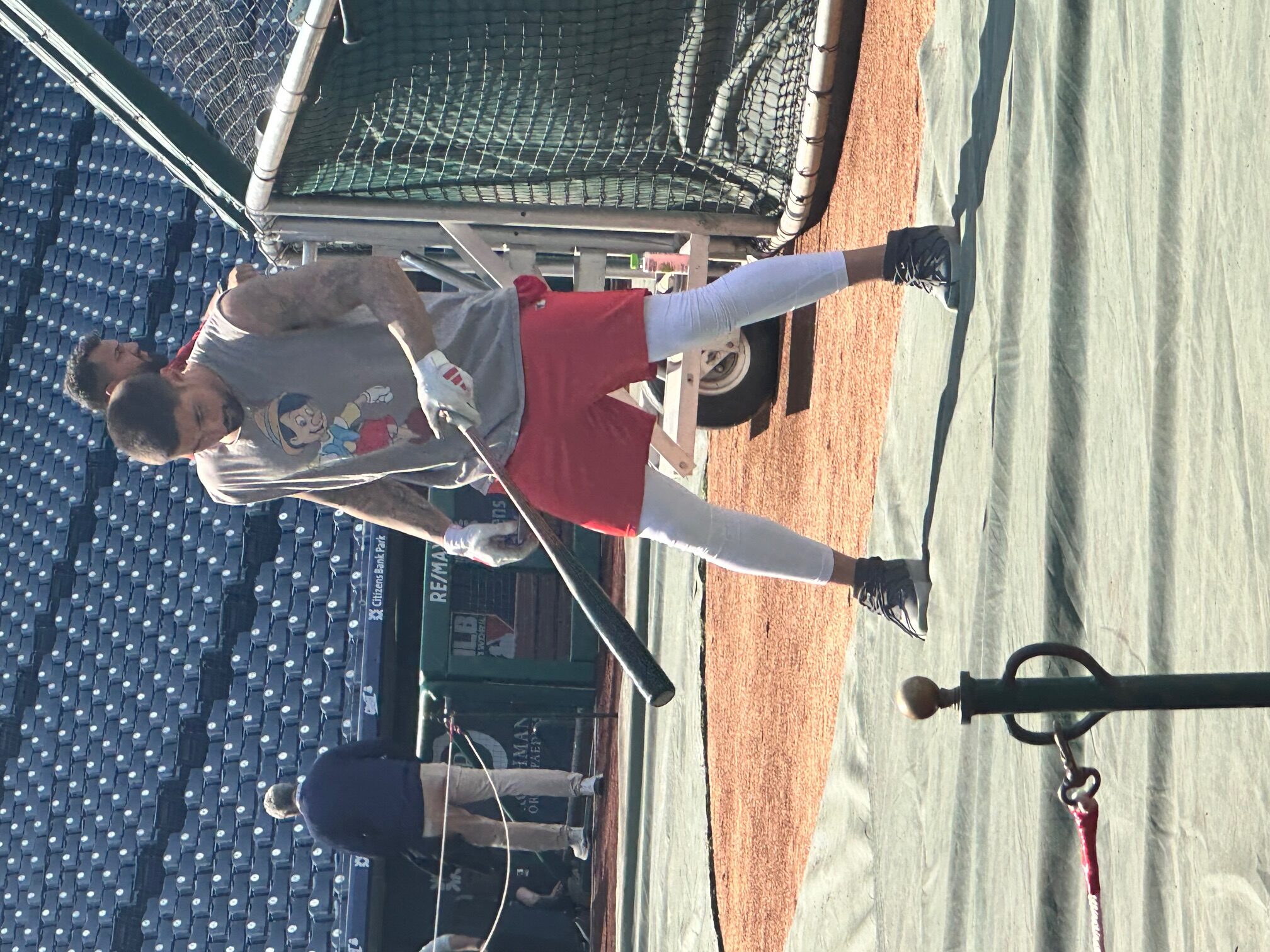 That’s why he’s out there is his sleeveless Pinocchio t-shirt, which has become his early BP fit this season, and holding court with guys struggling to find their identity at the plate.