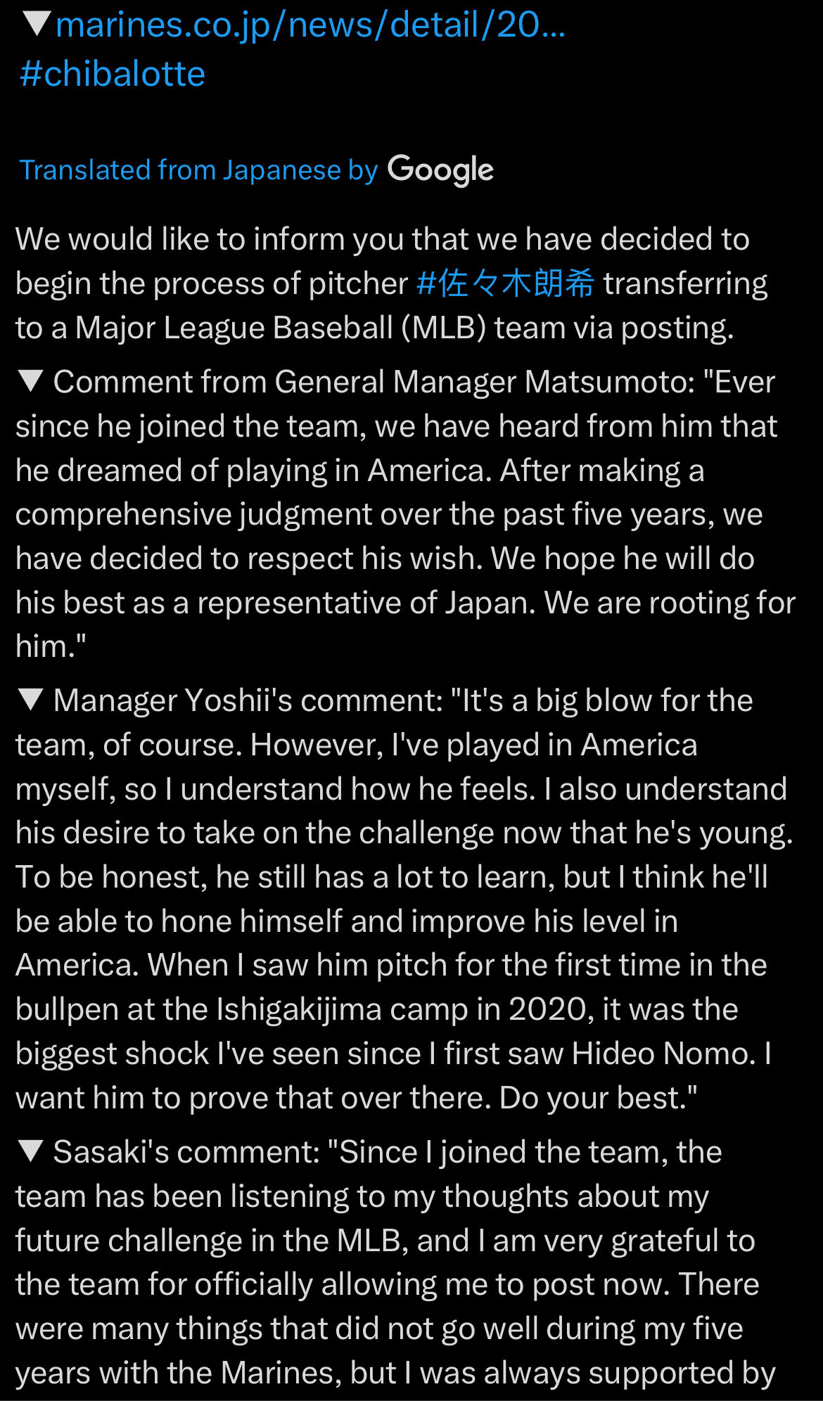 ESPN’s Jeff Passan reported Saturday that Sasaki’s NPL club, the Chiba Lotte Marines, initiated the “posting” process, “paving the way for the 23-year-old to join Major League Baseball in 2025.”