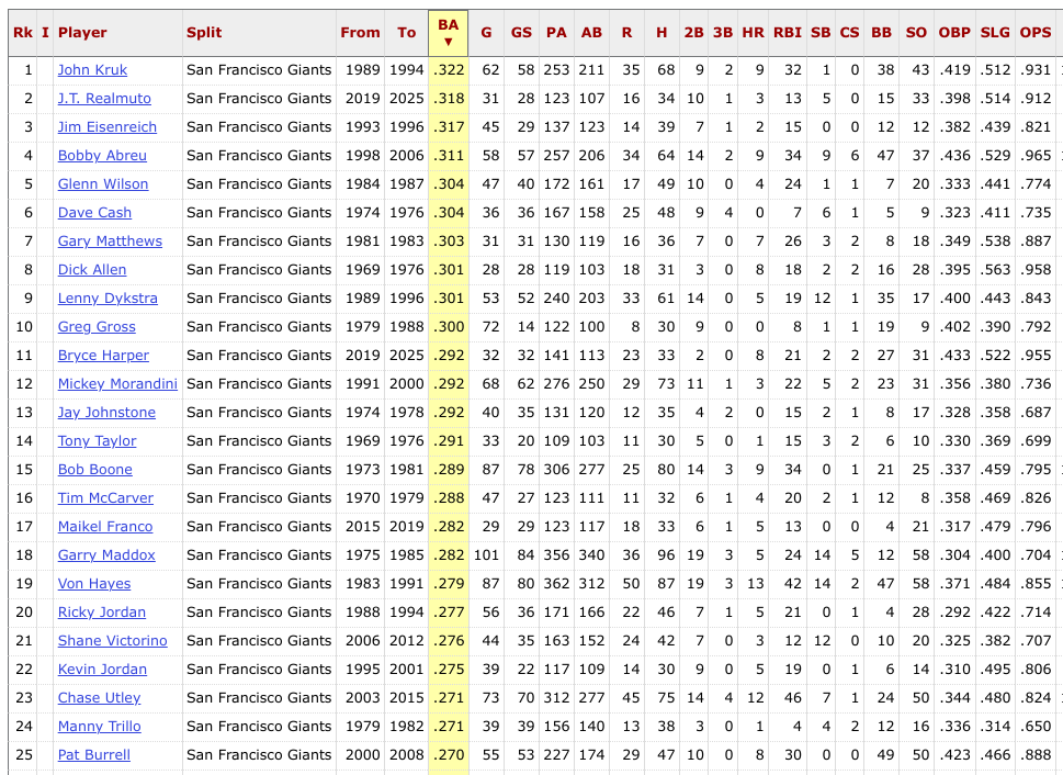 © Rob Schumacher/The R | 2023 Oct 25John Kruk hit .322 in 211 ABs against the Giants as a member of the Phillies. That narrowly edges out J.T. Realmuto’s .318 and Kruk’s old teammate Jim Eisenreich’s .317 as the highest average. Bobby Abreu (.311) and Glenn Wilson (.304) round out the top five.