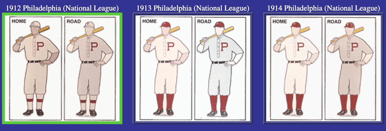 Courtesy of the Baseball Hall of Fame’s “Dressed to the Nines” exhibit, here’s a look at some of the uniforms that the Phillies wore during that stretch: