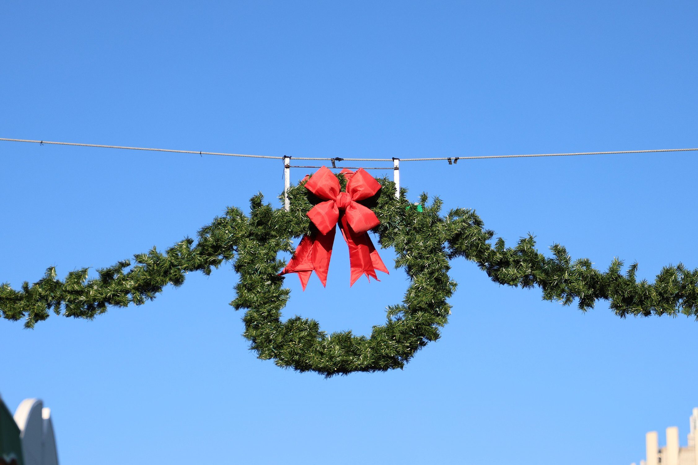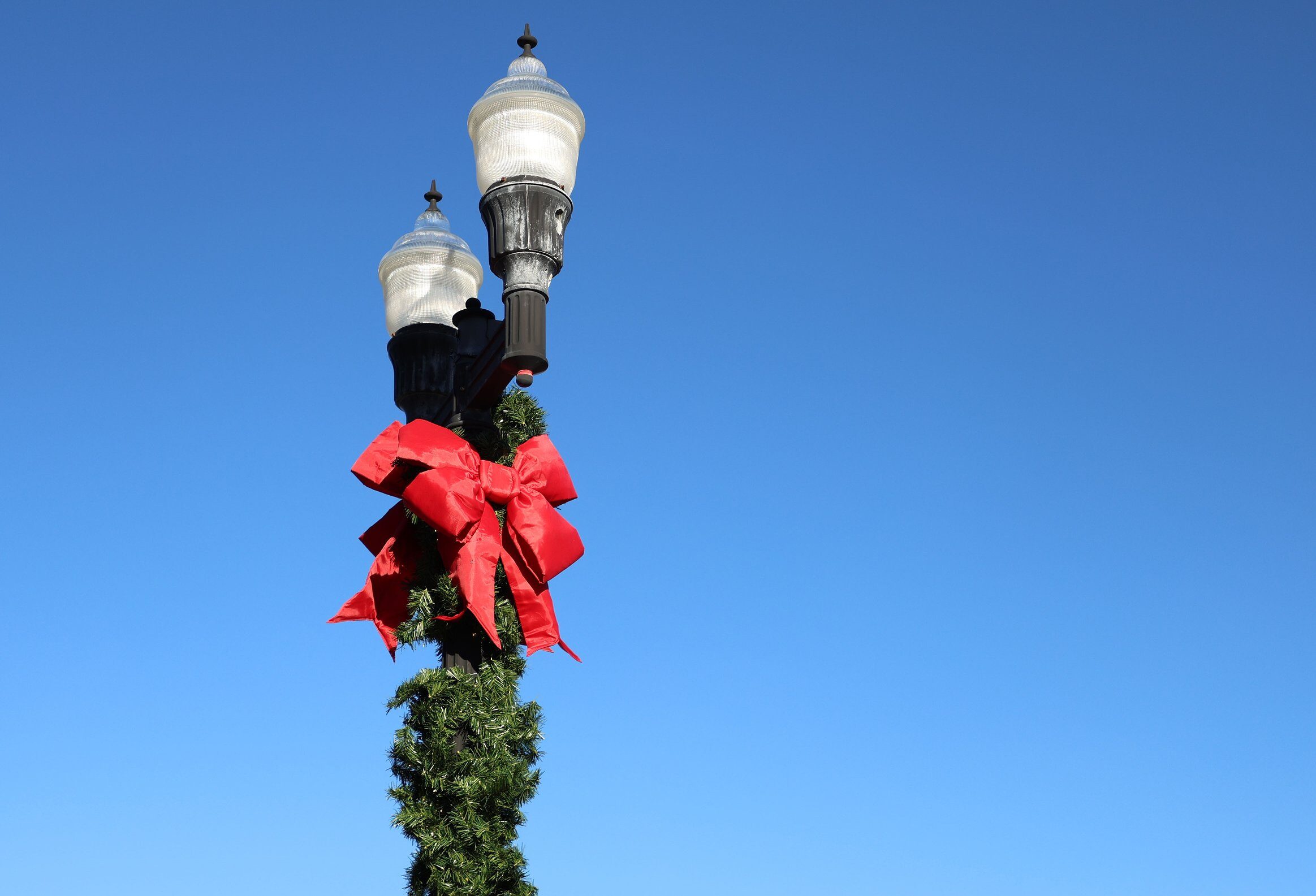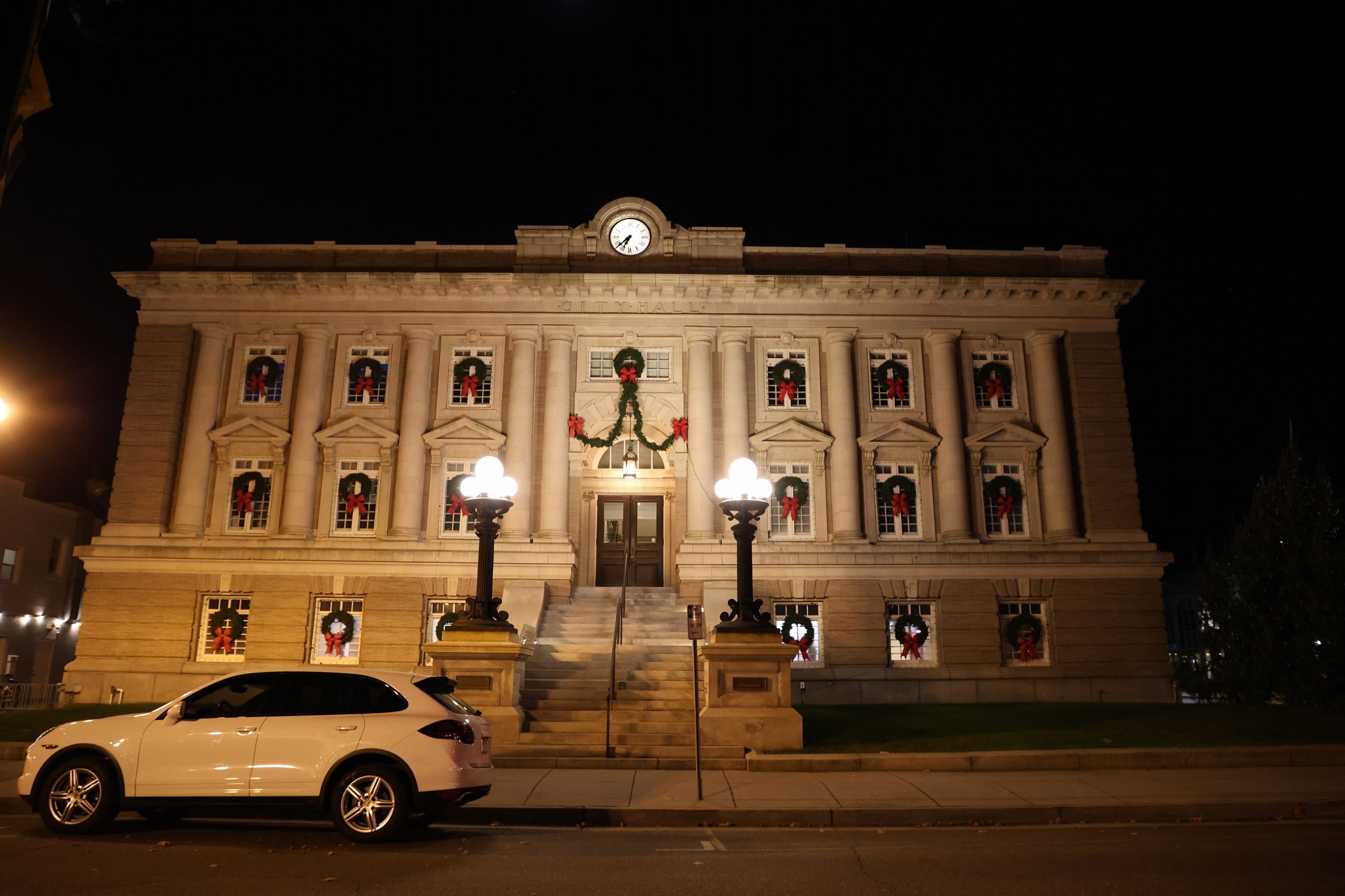 City Hall is decorated with wreaths on each window and a large Christmas tree on its lawn facing the corner of Ninth Street.